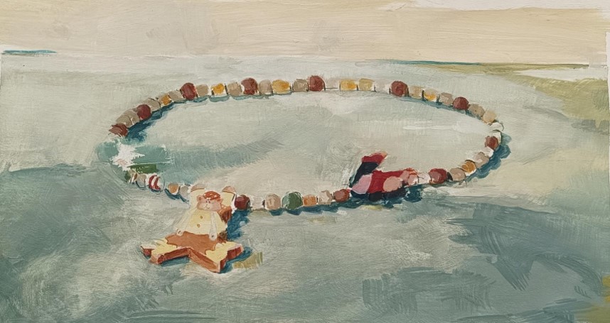 Still life painting displaying gifted necklace from Tsagaan Sar (Цагаан сар) exploring childhood memories