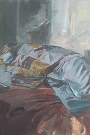 Esugen’s grandmother has introduced her to textiles and the world of art so these life paintings of her textiles serve as a gift of gratitude. These display a boro-sashiko tote bag and a potrait of her sleeping grandmother wrapped by her own quilt jacket she made.