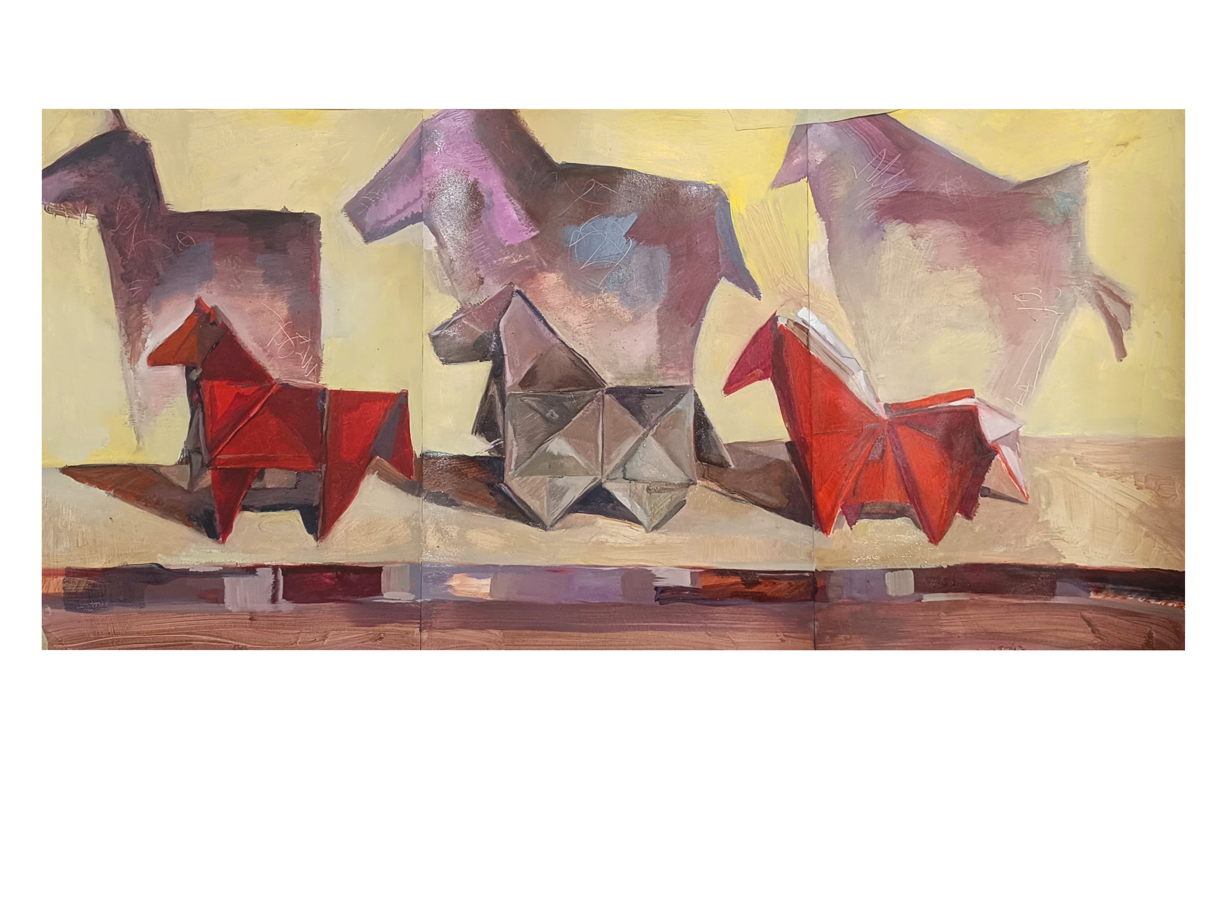Still life paintings of oragami fire horses exploring fold, intention, mind and heart connection, finding that a square holds the structures of the universe. Horses being the Mongolian symbol of freedom, the artist sees the horse as a paternal figure of resistance and presistence.