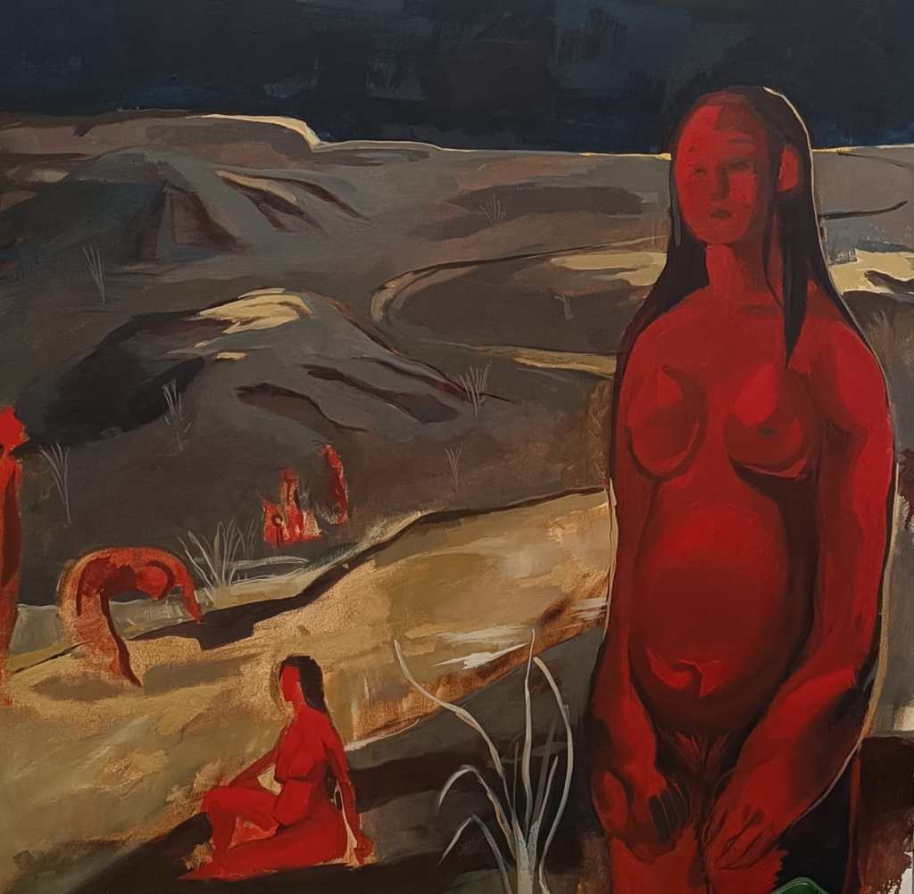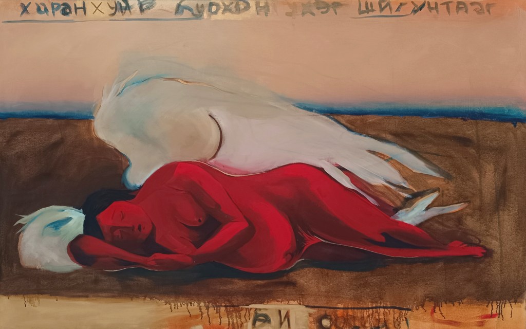 The central figure braids her hair in the iconic Mongolic hair style many women use as a symbol of work ethic and beauty. This imaginative painting explores the psyche, soul, femininity, mortality and Mongolianess.