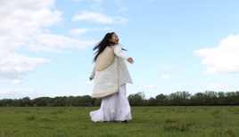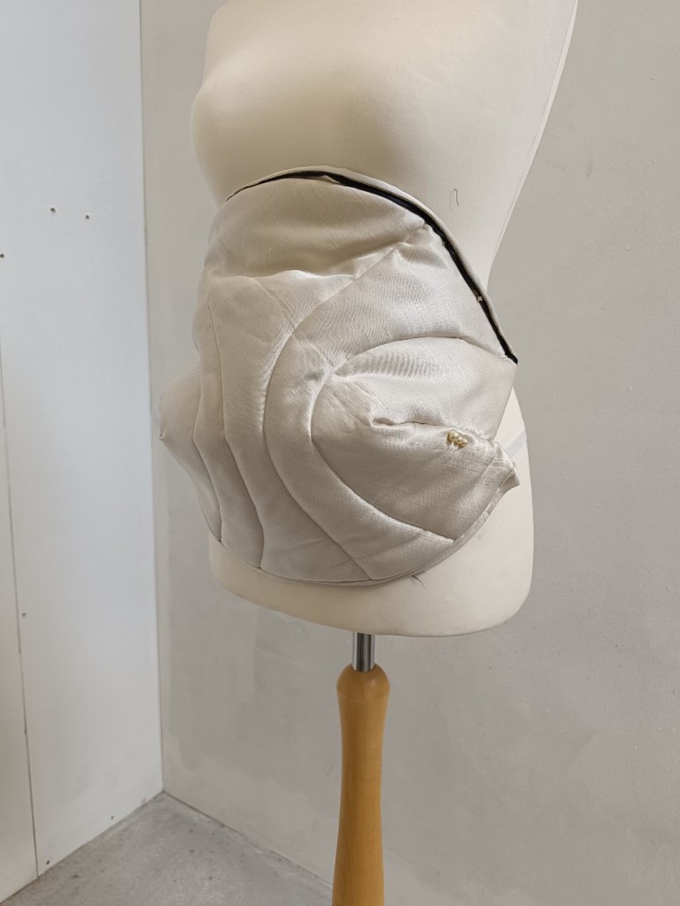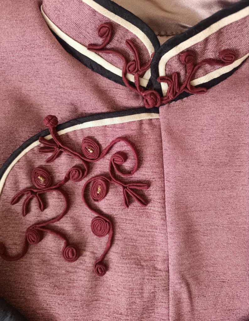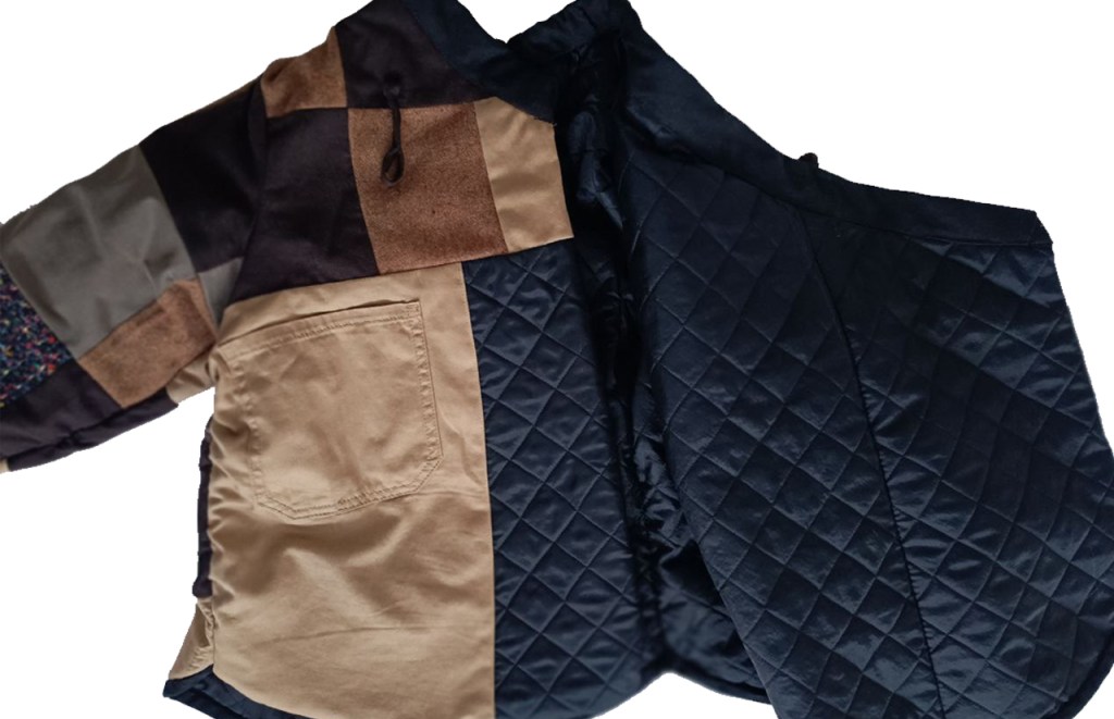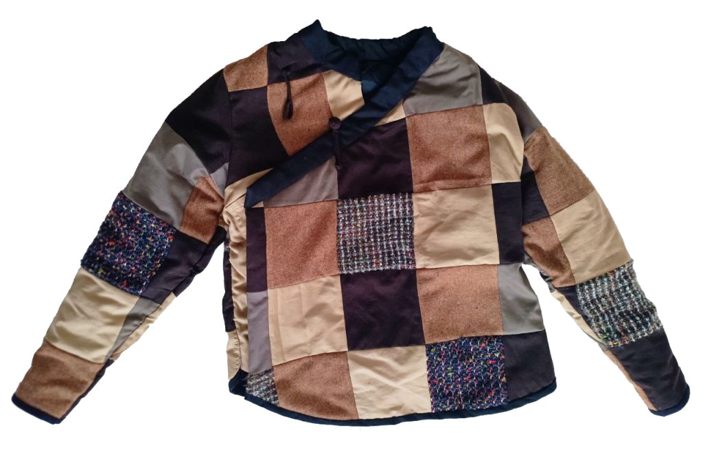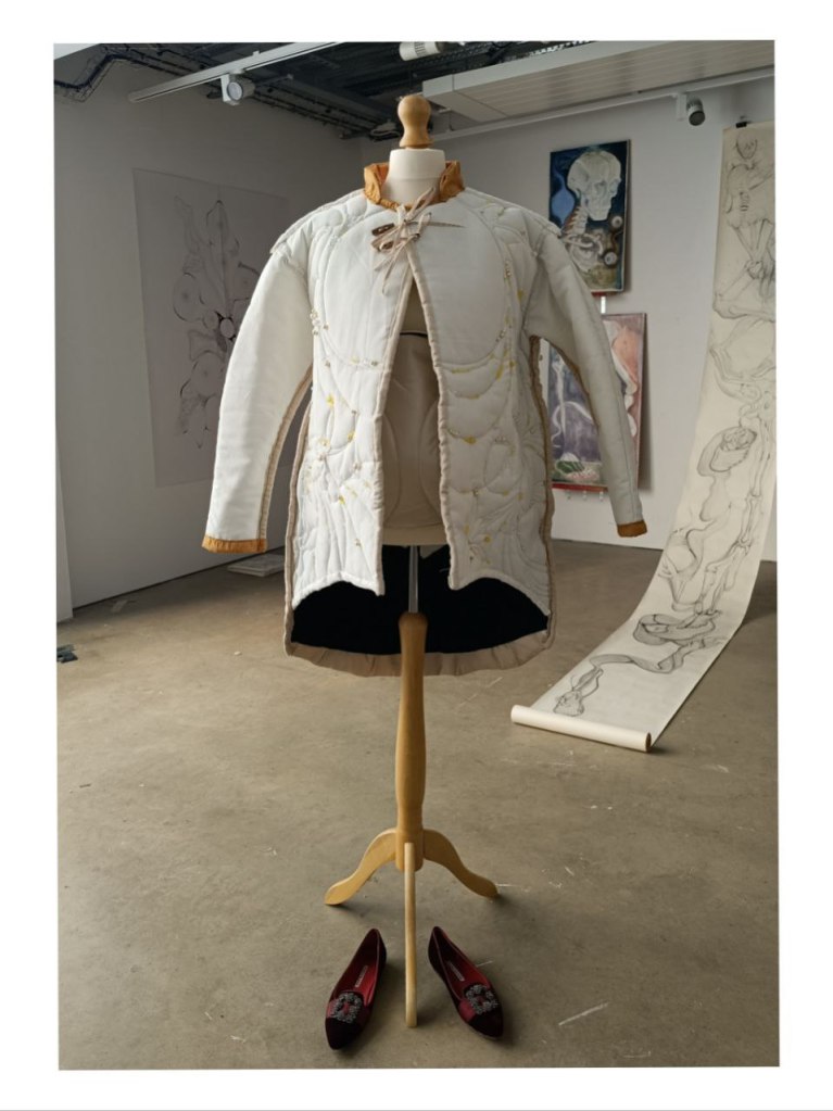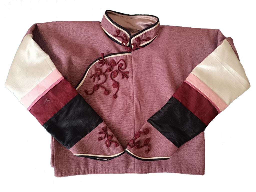 ‘The Mongolian deel was created to adapt to its harsh environment, being worn in sleep and work with long sleeves to act as gloves and a train that covers the feet. Though this doesn’t have a long train, it resembles a celebratory garment worn for show. However the shape has also came about from my previous modernised deel acting as a coat.